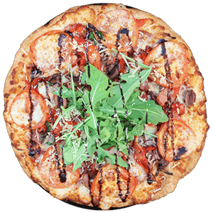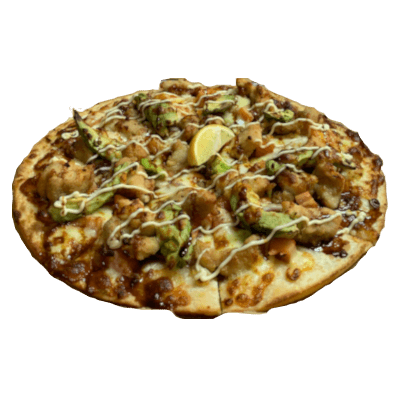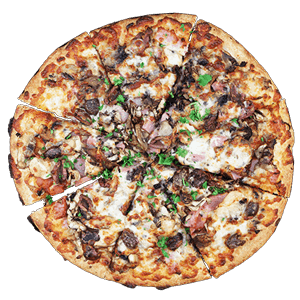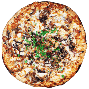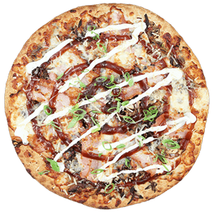 Chicken, onion, mushrooms, bacon, blue vein cheese, mozzarella, parmesan and shallots with bourbon bbq sauce and aioli