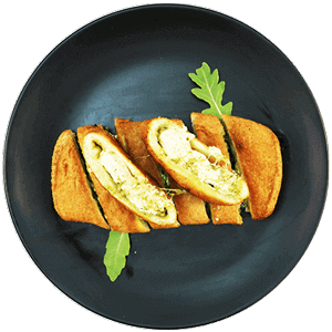 Karaage chicken, avocado, mozzarella, onion, tomato, shallots with mayo and sweet soy sauce