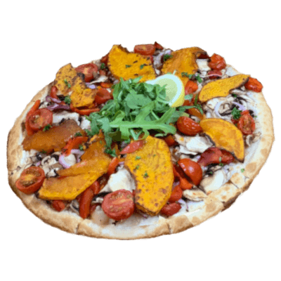 Mushrooms, capsicum, onion, cherry tomatoes, pumpkin, rocket, dairy free cheese and fresh herbs