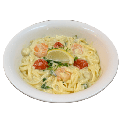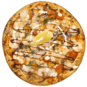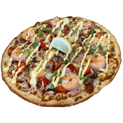 Barramundi, calamari, prawns and scallops, with capsicum, onion, shallots, mozzarella, citrus aioli and lemon pepper