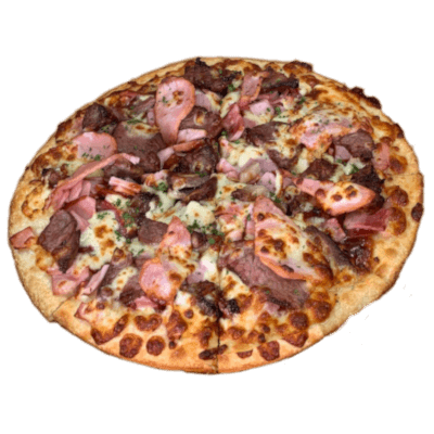Bbq sauce, Pepperoni, beef, chicken, ham, bacon, mozzarella and fresh herbs